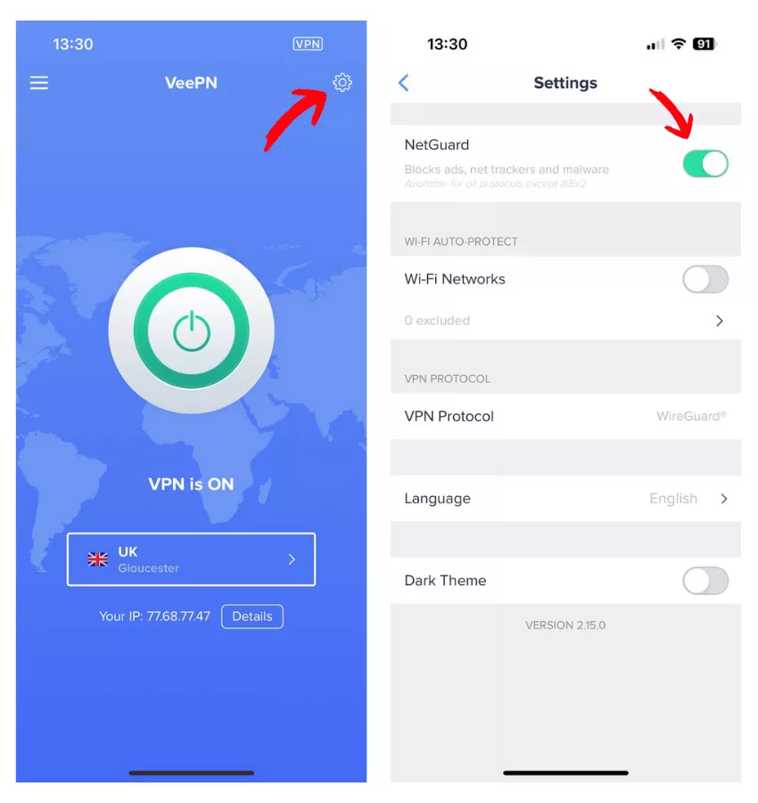 VeePN 网络卫士作为另一项福利。在应用程序的设置中启用它可以消除烦人的弹出窗口、躲避跟踪器并绕过恶意网站。就这样!
