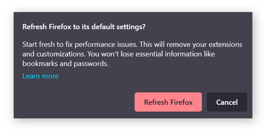 Firefox 的刷新功能与 Chrome 不同,因为它不会删除您的 cookie。另外,您不在浏览器中执行此操作。 Firefox 在其网站上有一个按钮可以打开此窗口: