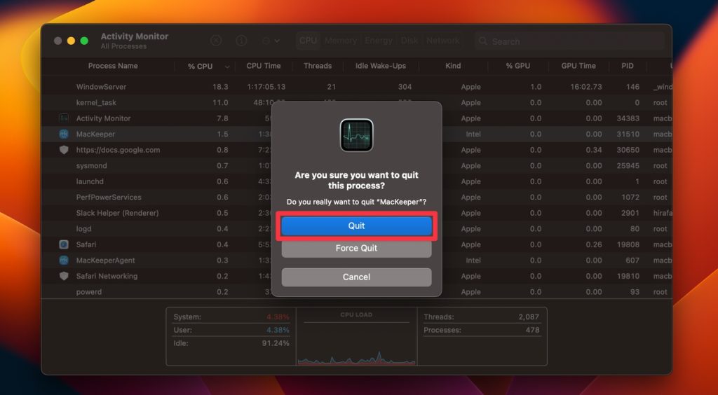 2.在活动监视器中关闭CPU使用率高的应用程序