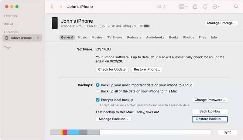 如果您使用的是装有 macOS Catalina 或更高版本的 Mac,则可以使用 Finder 绕过 Apple Screen Time。但需要注意的是,这种方法还涉及设备擦除和数据丢失。此外,此方法仅在“查找我的 iPhone”功能被禁用时才有效。您可以这样做: