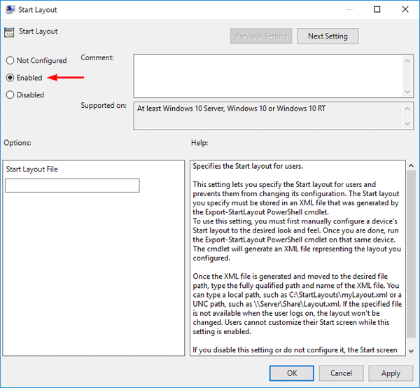 - 在本地组策略编辑器的右侧,双击标记为开始布局要打开其属性,请选择启用,然后单击申请。