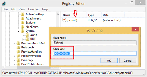 - 在注册表编辑器窗口中,导航至HKEY_LOCAL_MACHINE\SOFTWARE\Microsoft\Windows\CurrentVersion\Policies\System\UIPI。在右侧,双击默认并将值更改为“0x00000001(1)”。单击“确定”。