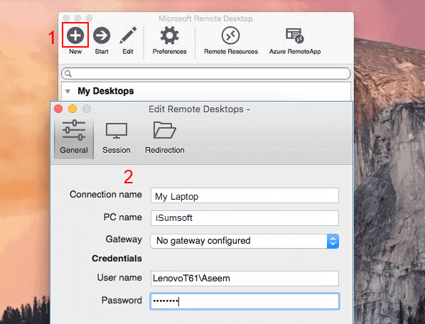 启动这个应用程序。在连接中心,单击+,然后单击桌面。进入电脑名称或 Windows PC 的本地 IP。然后添加用户帐号和密码您用来访问远程 PC。点击节省。单击屏幕左上角的红色关闭按钮即可完成添加新的远程连接。