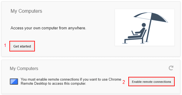 3. 在我的电脑下,单击开始使用。点击启用远程连接。 Chrome 将下载一个.dmg文件(在 Mac 上)或.msi文件(在 Windows 上)。点击节省。文件下载后,将其打开。