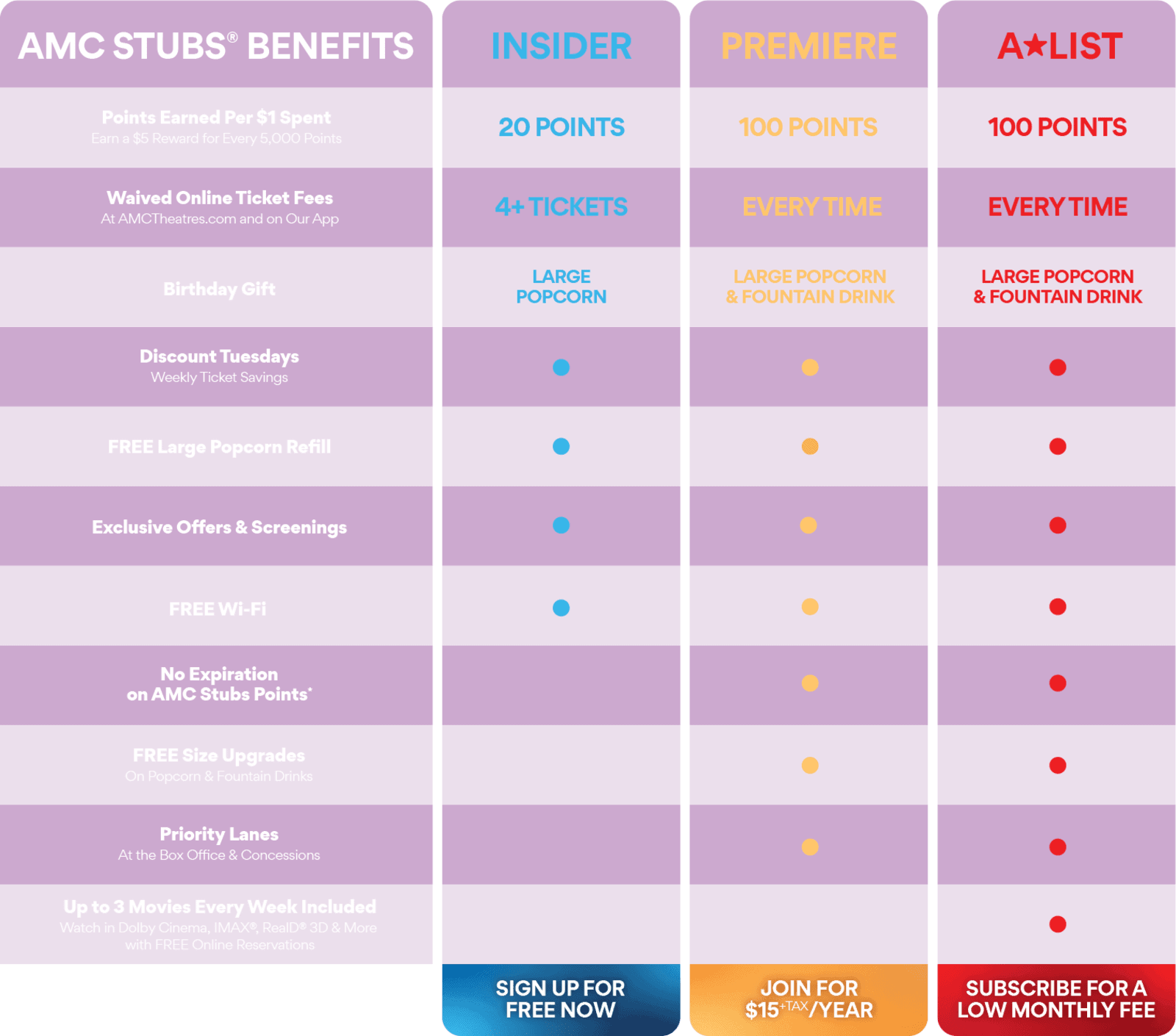 对于任何会员级别,您每消费一美元即可赚取积分,但只有 A-List 会员每周最多可获得三张电影票。您可以观看任何格式的电影,包括 IMAX 和杜比影院等高级选项,无需额外付费。所有会员资格均包括免费在线预订、免费升级爆米花和饮料尺寸以及生日礼物等福利。