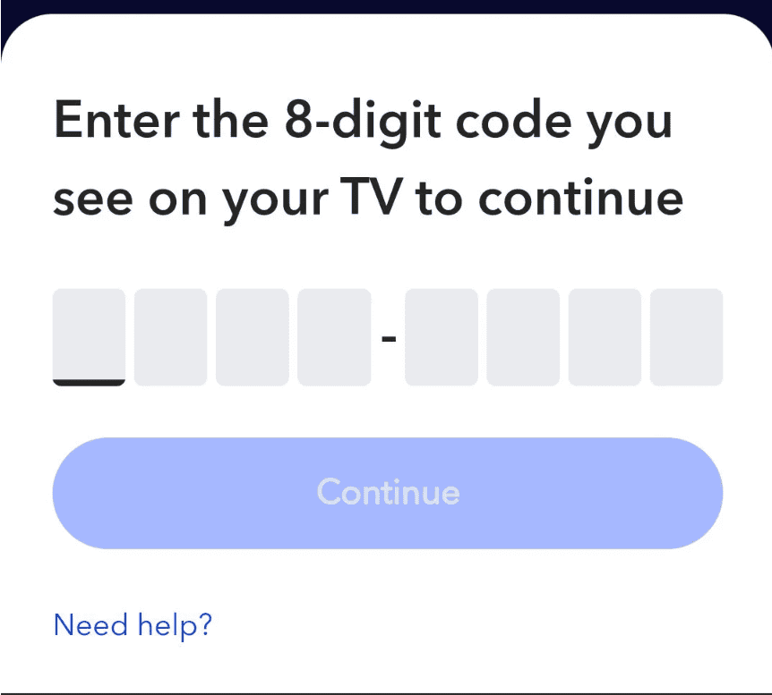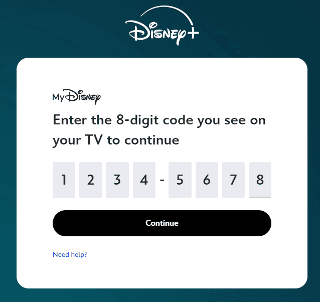 - 输入8位代码,然后按照提示使用您的迪士尼+帐户登录。