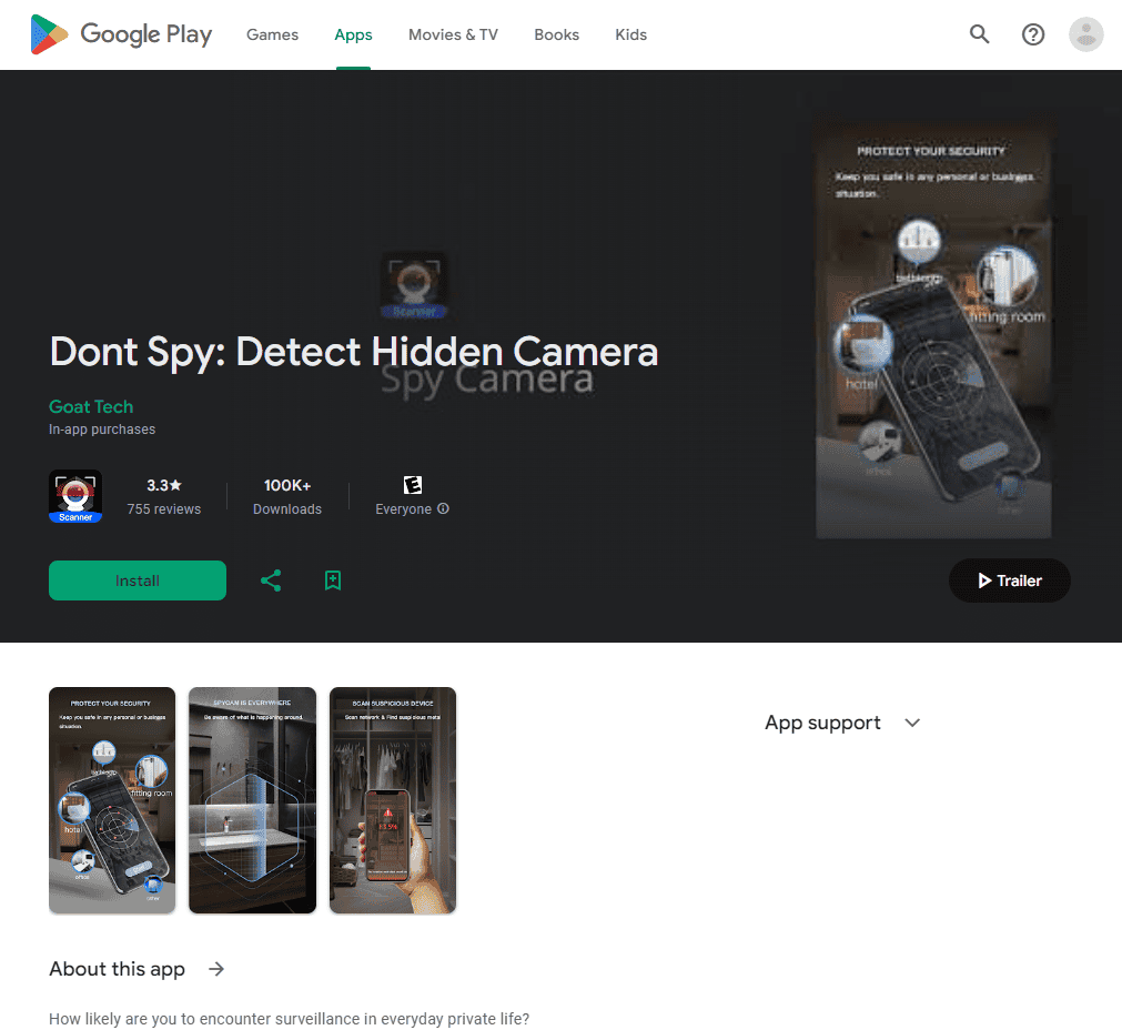 | Don’t Spy 2 – 间谍软件探测器 | 安卓 | 检测隐藏的摄像头、麦克风和其他间谍软件。 |