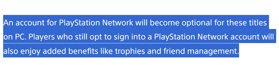 对于 PC 上的这些游戏来说,PlayStation Network 帐户将成为可选的。仍然选择登录 PlayStation Network 帐户的玩家还将享受奖杯和好友管理等额外好处。