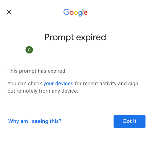出于安全原因,Google 2步验证提示旨在在短时间后到期。如果您错过了提示或已过期,这就是您可以做的: