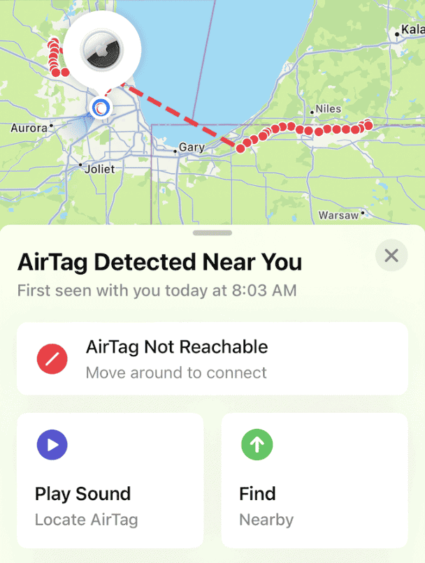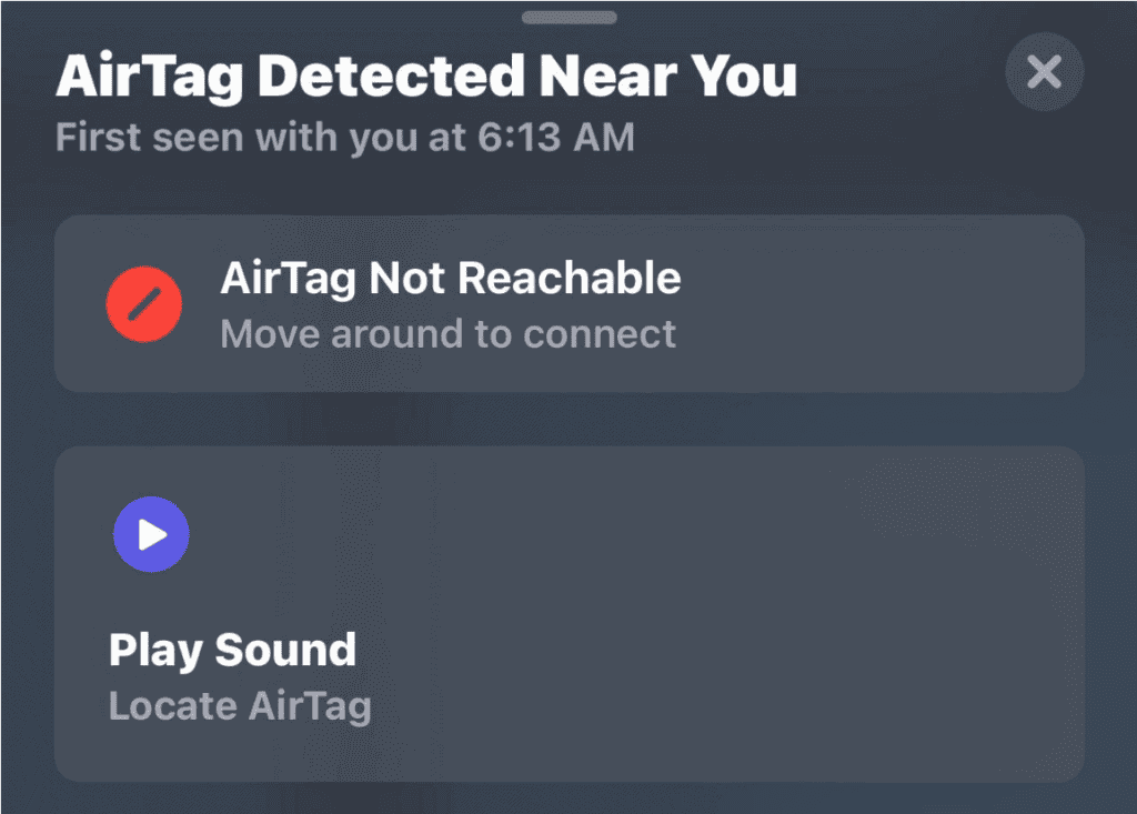 您将收到一条通知,告知您有 AirTag 随身携带。通过使用“查找我的”应用程序,您可以在 AirTag 上播放声音来定位它。如果您怀疑自己在未经同意的情况下被跟踪,请联系当地执法部门。