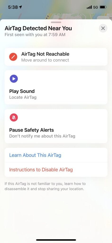 - 禁用 AirTag:如果您发现 AirTag 但它不属于您,您可以按照警报中的说明将其禁用。这将阻止它进一步跟踪您的位置。