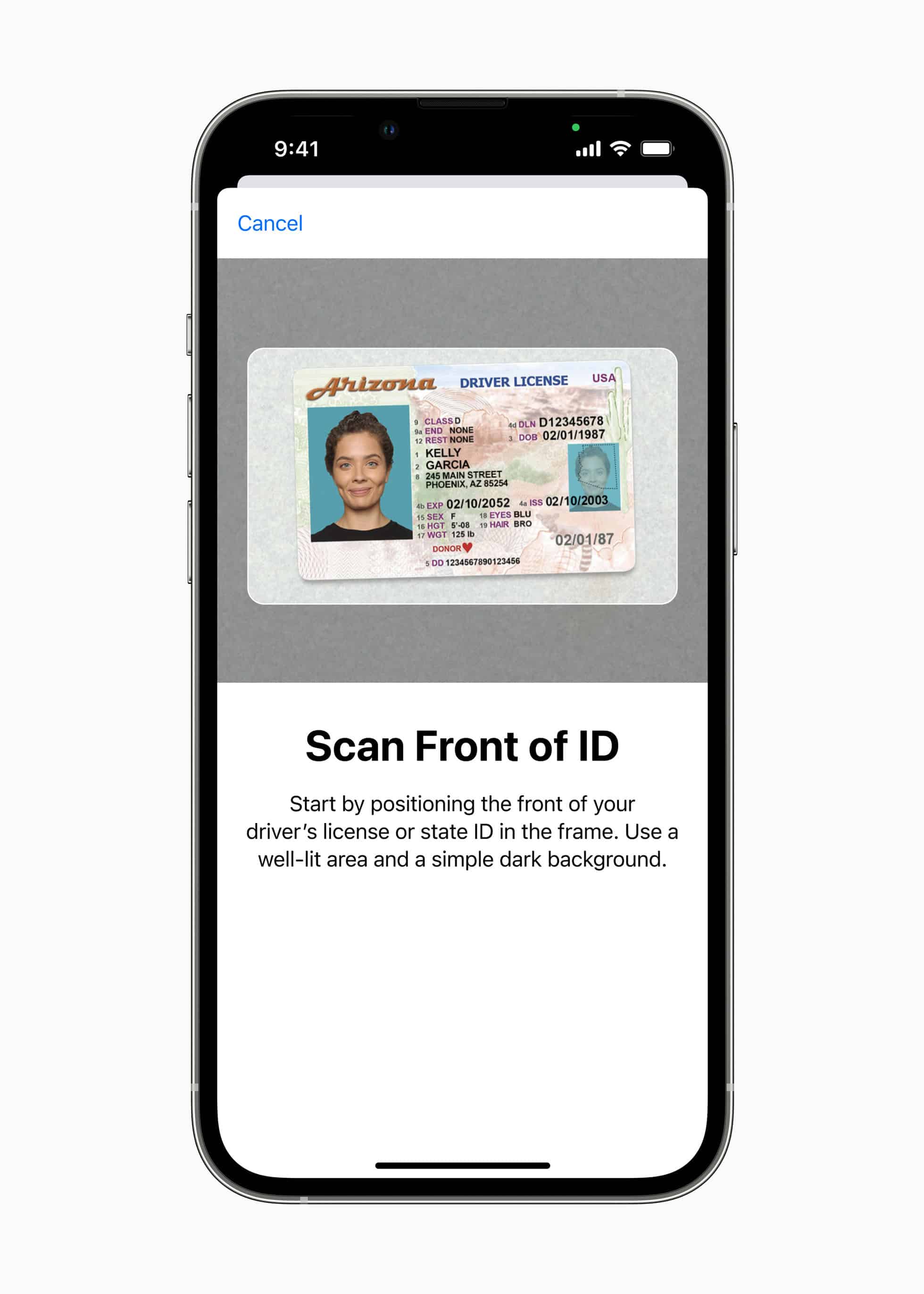 将 ID 添加到 Apple Wallet 的验证过程非常全面,可以防止欺诈。用户必须扫描其身份证件并拍摄与其身份证件照片相符的自拍照。