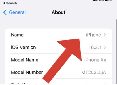 - 点击“名称”:“关于”部分的顶部条目将显示您 iPhone 的当前名称。直接点击名称字段。