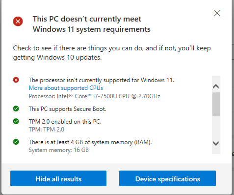 如果您的电脑未通过检查,应用程序将突出显示哪些组件不符合要求。此信息可帮助用户决定是否需要升级硬件或寻求替代方法。