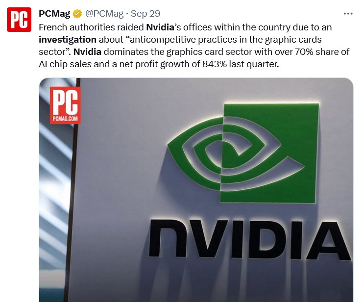 一切都开始于法国竞争管理局称其于9月27日突击搜查了一家属于“显卡行业”的公司,但未透露更多细节。熟悉此次突袭行动的人士告诉华尔街日报(《华尔街日报》)称,此次行动的目标是英伟达,据我们所知,英伟达是全球最大的人工智能和计算机图形芯片制造商。
