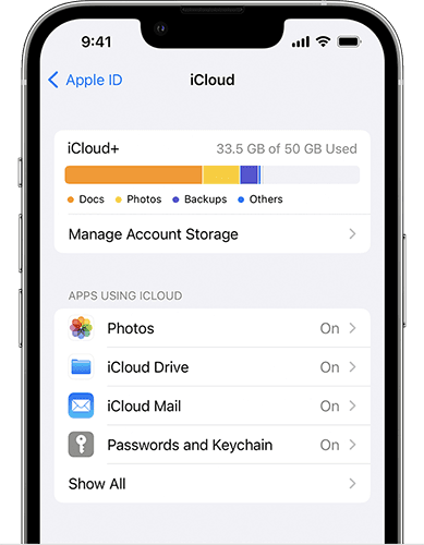 - 在您的 iPhone 上,轉至設置 > [您的名字] > iCloud。打開“我雲盤”並確保您要訪問的文件已備份到 iCloud。