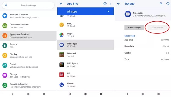 如果情況沒有改變,則需要檢查緩存和應用程序數據。如果您使用某個應用程序的時間過長,它會收集緩存,這在某個時候可能會出現問題,並且可能無法讓您順利使用該應用程序。因此,如果您沒有在 iPhone 或 Android 上收到某人的短信,我們的下一個建議是清除消息應用程序的緩存。步驟是: