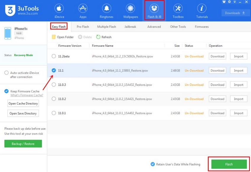 該界面簡化了自定義 iOS 固件版本的選擇和安裝。然而,3uTools 很容易出現錯誤,從而導致設備變磚或導致數據丟失。