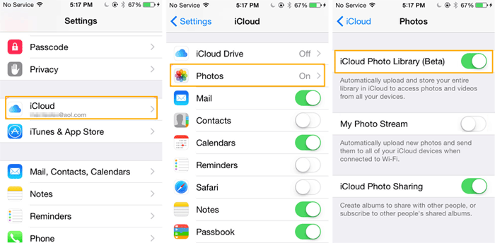 步驟1。解鎖您的iPad。轉到“設置”> [您的名字]>“ iCloud”>“照片”,然後打開“ iCloud Photos庫”的開關。