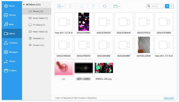 步驟2。從左圖單擊“視頻”。等待幾秒鐘,然後將列出包含電影的視頻文件。只需轉到頂部菜單即可點擊“添加”按鈕(“+”圖標),然後預覽電影以進行傳輸即可。