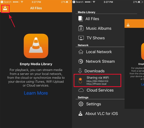 步驟1。下載和安裝後,在iPad上啟動VLC應用程序。然後點擊左上方的圖標。接下來,打開“通過WiFi共享”,並記住屏幕上的IP地址。 (如有必要,您可以拍攝地址的照片)