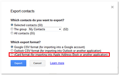 - 在“導出聯繫人”窗口中,根據您的需要選擇“選定的聯繫人”或“所有聯繫人”。