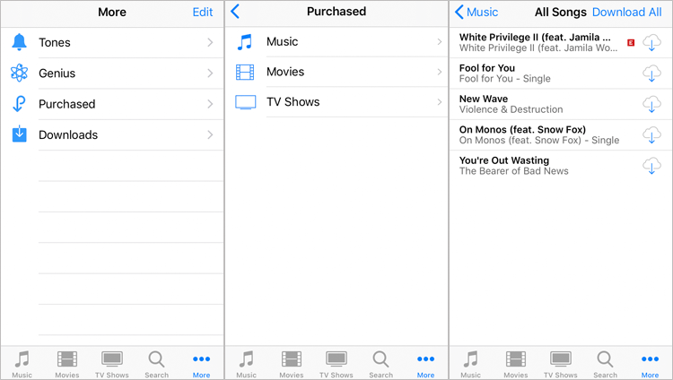 步驟2。啟動iTunes商店應用程序,以獲取此設備上的“更多”>“購買”。接下來,選擇“音樂”,然後選擇“不在此iPod上”選項。