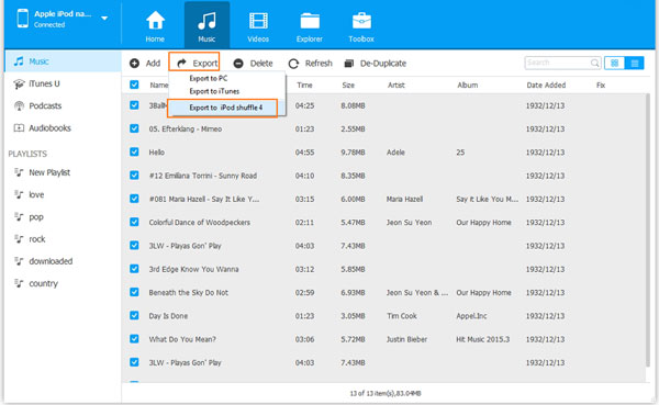 從頂部菜單中點擊“導出”按鈕,以相應地選擇將音樂從舊iPod傳輸到新iPod的目標iPod。