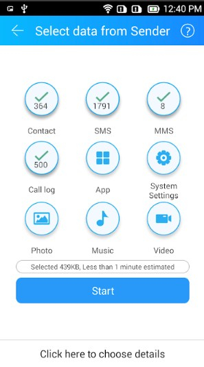 步驟3:移動 - 識別後,在接口上,選擇要傳輸的數據類型,然後單擊“啟動複製”以啟動傳輸。完成後,斷開設備並驗證收件人上所有傳輸的數據。