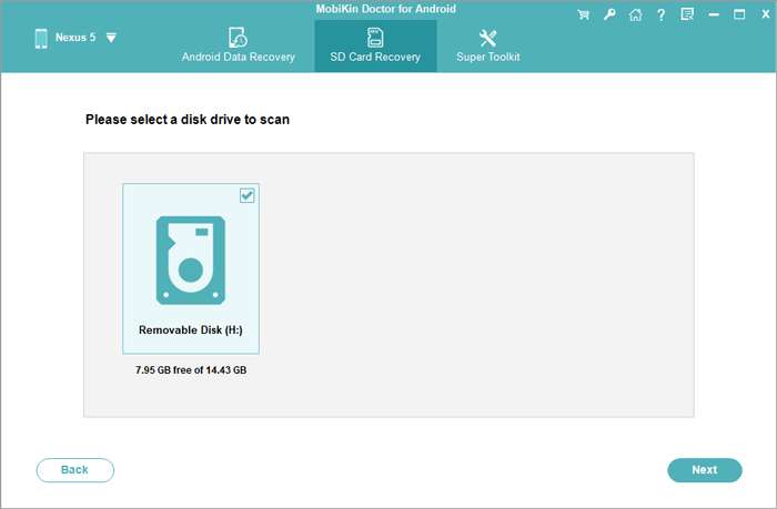 步驟2。程序將自動檢測該卡,其圖標將顯示在窗口中。選擇該卡並單擊“下一步”開始掃描丟失的多媒體文件。