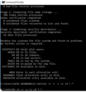 - 在命令提示符中,鍵入: attrib -h -r -s /s /d E:\*.*