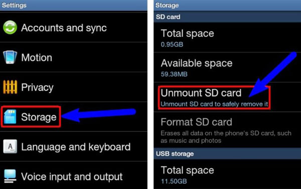 - 在“設置”中,轉到“存儲”並選擇“卸載 SD 卡”。
