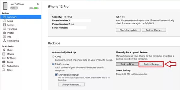 步驟4:要從 iTunes 備份恢復,請單擊頂部菜單中的“恢復”按鈕,然後選擇所需的備份文件。