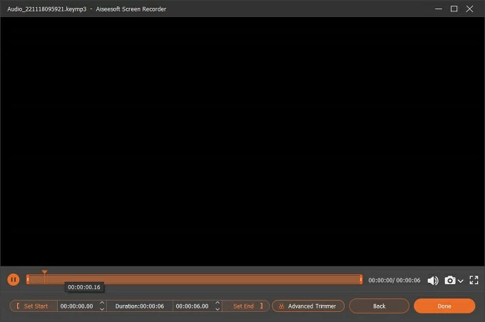 錄製結束時,您可以使用高級修剪器選項。您可以修剪音頻,添加段并快速拆分。這淡入和淡出還可以使用功能來使您的錄製不同。之後,單擊完畢為了將配樂保存在PC上。