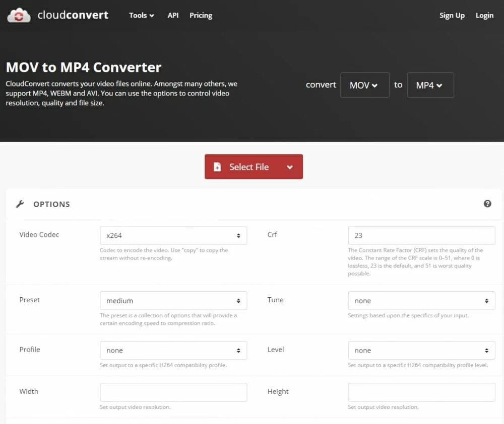 速度、質量和對多種視頻格式的支持是這款在線 Mac MP4 轉換器的主要特點。它可以立即將 AVI、Webm、VOB、WMV、MTS、MOV 等轉換為 MP4,而不會造成質量損失。還提供有用的選項來控制視頻大小、質量和分辨率。以下是如何在 CloudConvert 中使用 MOV 到 MP4 轉換器 Mac:
