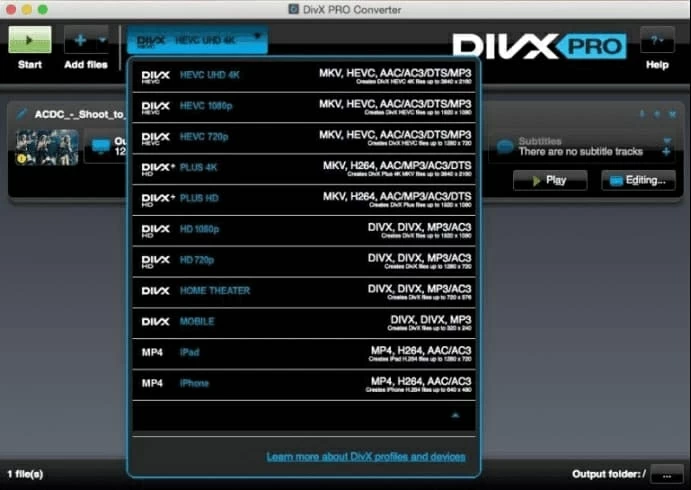 DivX Converter 由 DivX Inc 開發,專為創建 DivX、AVI、MKV 和 MP4 視頻而設計。它還提供了高達 4K 的輸入和輸出格式的不錯列表,儘管配置文件的丟失比本文中列出的任何其他強大的 MP4 轉換器 Mac 免費的要少。儘管一些功能被鎖定在付費版本之後,但它仍然值得探索。 64 位版本的應用程序不可用。