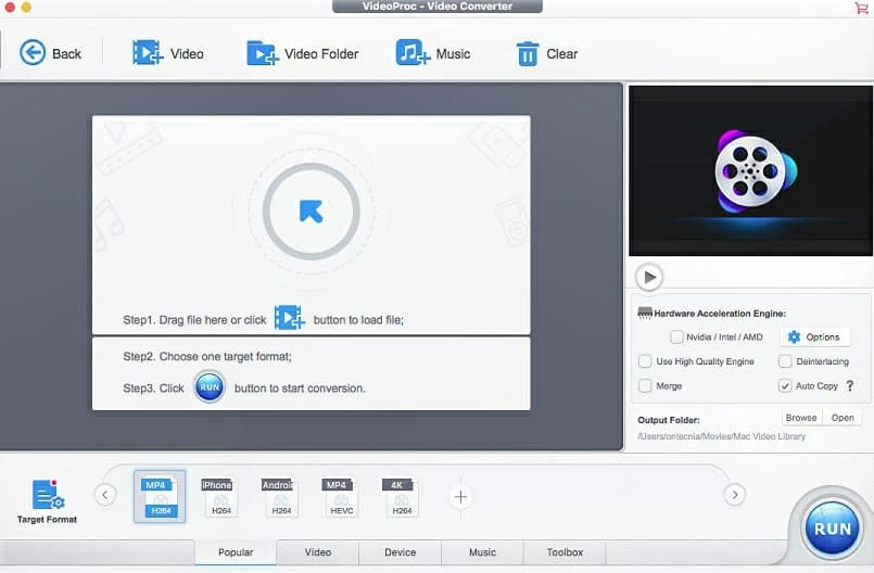 VideoProc 是一款完全免費的 Mac MP4 視頻轉換工具,具有完整的 GPU 加速功能。它具有數十種輸出格式庫,可以轉換來自 GoPro 的音軌、視頻、DVD 以及 4K 片段,而不會影響質量。有時它會給你錯誤的默認音軌。