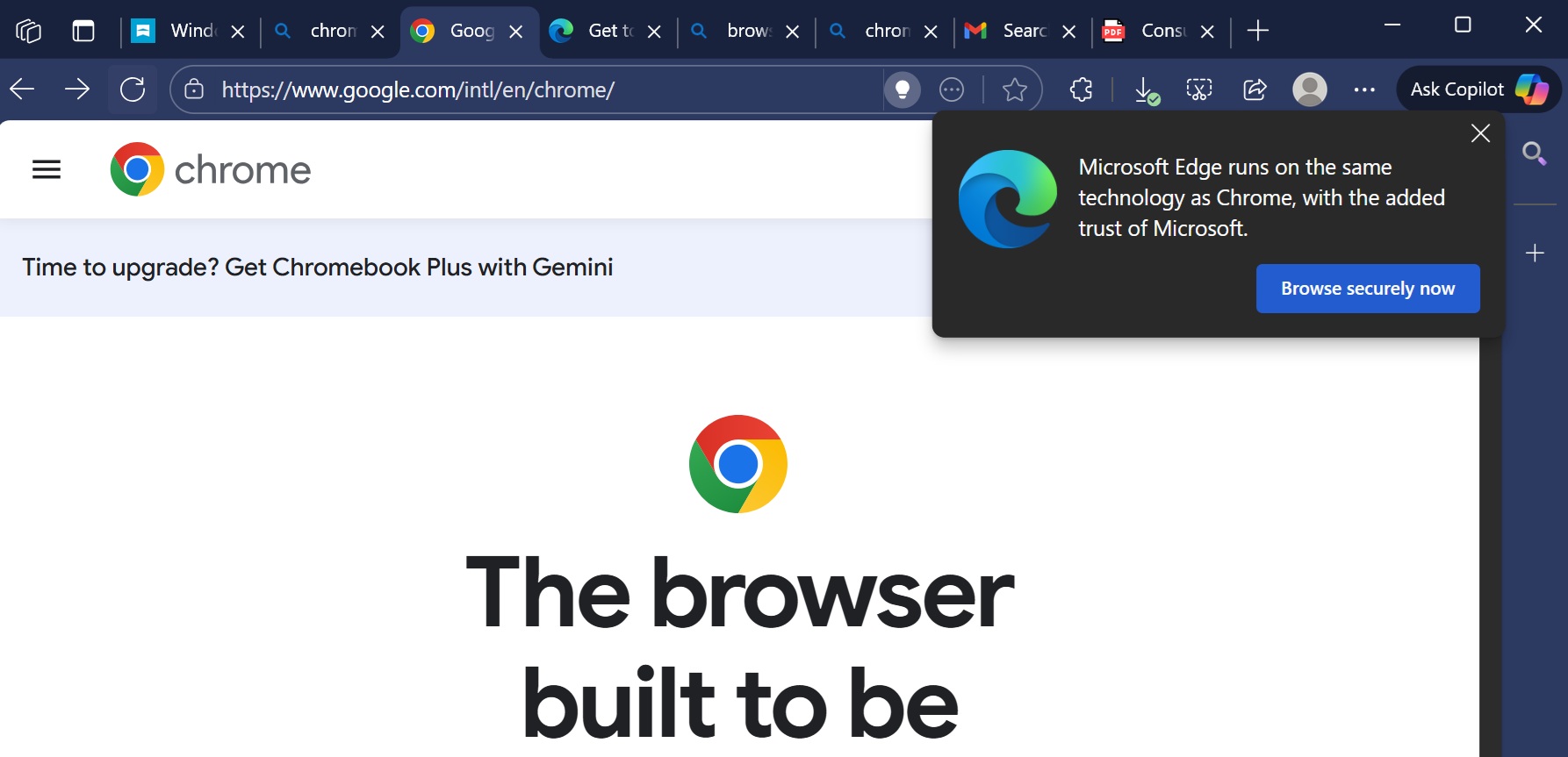 此前,當您在 Bing 上搜索 ChatGPT 或 Gemini 時,Windows Last 會發現 Copilot 廣告。現在,當您在 Bing.com 上搜索 Chrome 時,我們有一個比較記分牌,可以宣布 Edge 獲勝。
