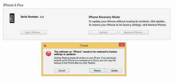 步驟2。進入該模式後,電腦上的iTunes會彈出一個對話框,要求你選擇“恢復”或“更新”。在這裡,只需選擇“恢復”即可。