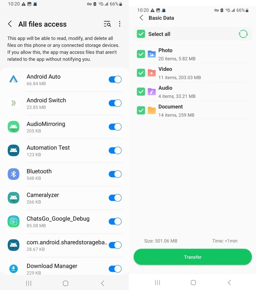 步驟2現在,通過切換首選應用程序來授予對文件的訪問權限,然後繼續操作。然後,啟用“照片”選項和要傳輸的其他數據,然後按“傳輸”按鈕。
