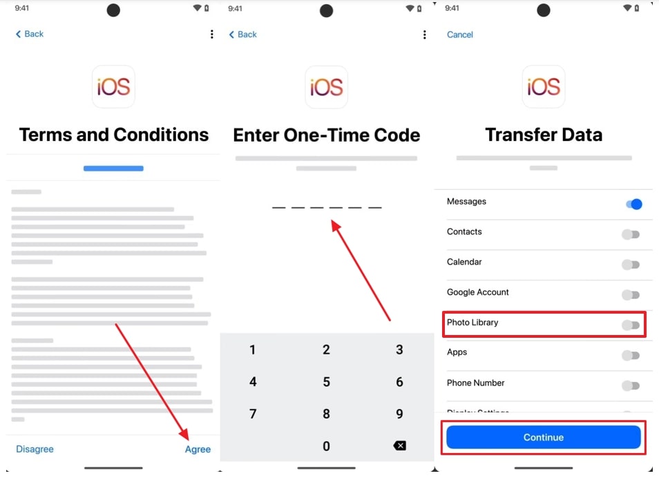 步驟2接下來,在您的三星設備上下載該應用程序並按“同意”選項。接下來,輸入您從 iPhone 獲得的代碼以激活“照片庫”開關,然後點擊“繼續”開始傳輸。