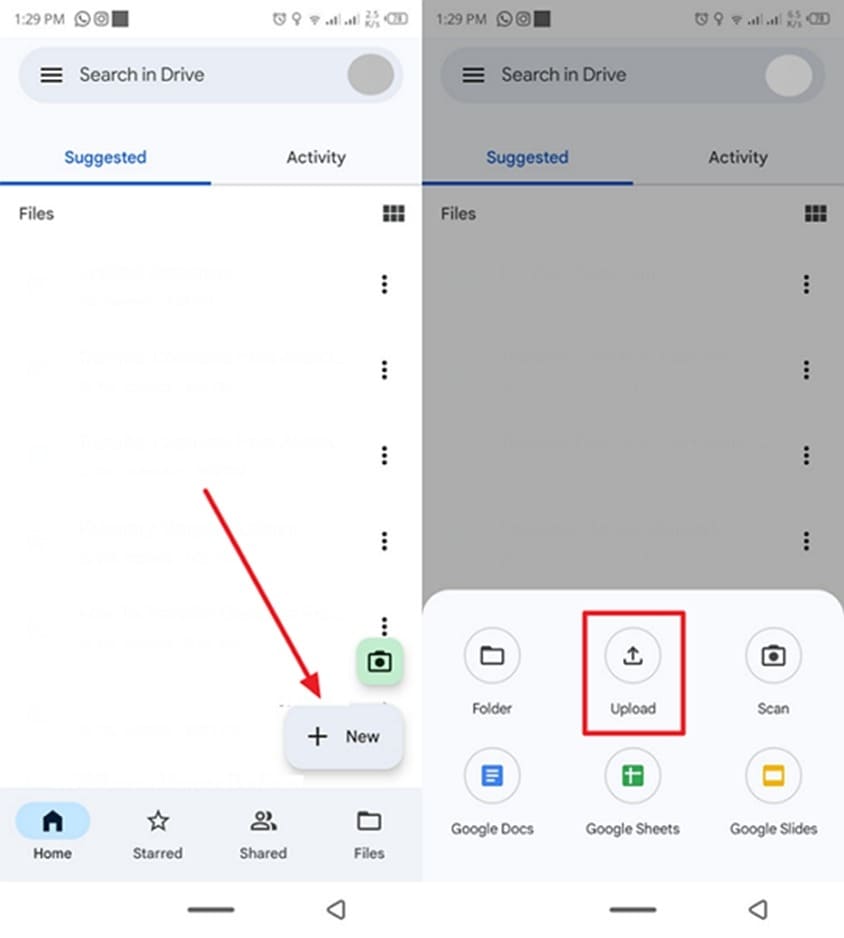 步驟1訪問三星上的 Google Drive,然後按“+ 新建”圖標導入圖像。現在,點擊“上傳”按鈕,然後從圖庫中選擇要上傳的圖片並添加它們。