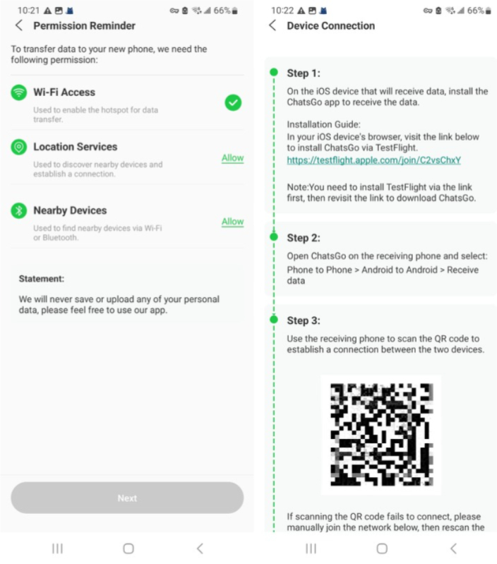 步驟3然後,允許“Wi-Fi 訪問”、“位置服務”和附近設備的權限,然後點擊“下一步”按鈕。現在,從 iPhone 掃描二維碼,開始將數據從三星傳輸到 iPhone。