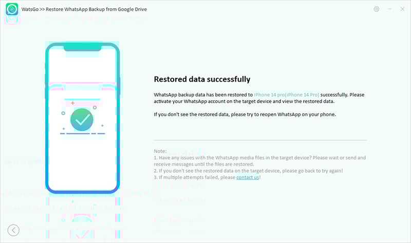 步驟3。下載“從Google Drive中的WhatsApp備份”後,單擊“還原到設備”選項。確保將您的設備連接到要還原數據的位置。