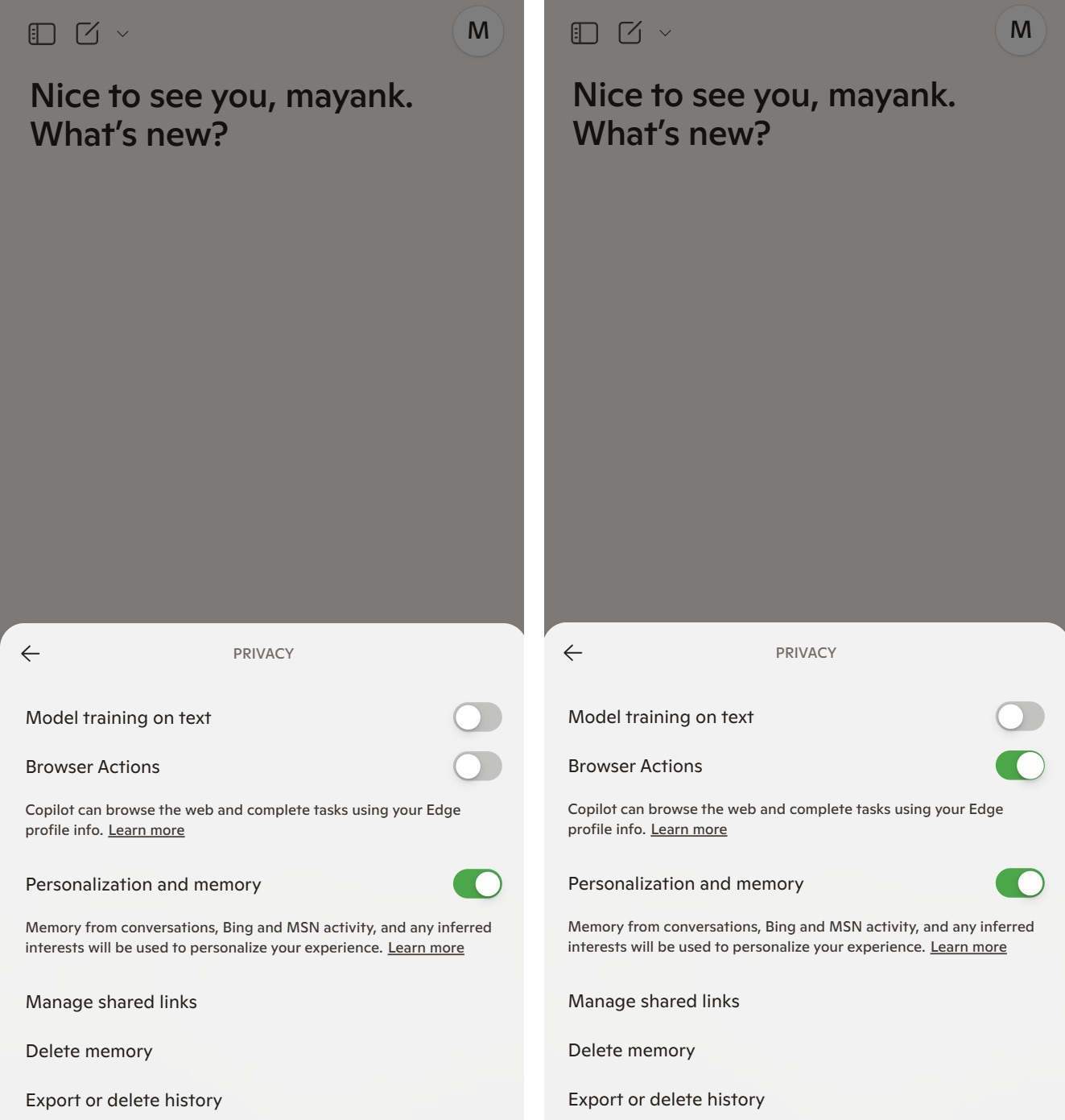 正如您在下面的屏幕截圖中看到的,Edge 上的 Copilot 正在測試一個名為“瀏覽器操作”的開關,如果打開該開關,Copilot 將能夠訪問 Edge 配置文件。現在,事情就變得有趣了。 Edge 配置文件包含您的所有詳細信息,包括您的密碼、登錄網站、瀏覽歷史記錄等。
