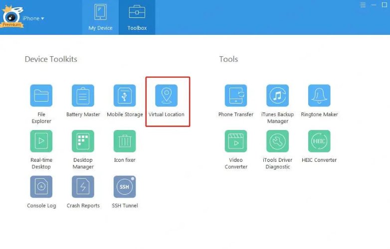 2.啟動3uTools,進入“工具箱”選項卡,然後單擊“虛擬位置”以訪問位置欺騙功能。