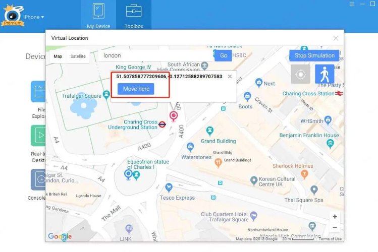3.打開位置欺騙應用程序並設置所需的 GPS 坐標或在地圖上選擇一個位置。