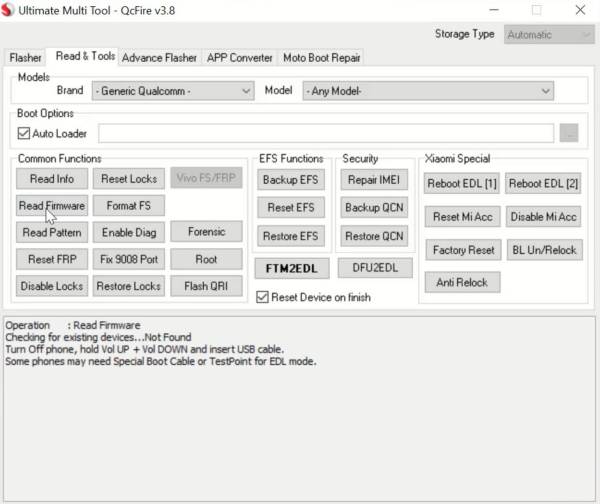 終極多功能工具 – QcFire 專為與基於 Qualcomm 的智能手機配合使用而開發。它有助於通過 ADB、Fastboot 和 Qualcomm EDL (9008) 模式檢測設備。它允許使用 Firehose 加載程序刷新庫存固件、讀取分區表以及恢復和備份重要分區。它具有出廠重置、FRP 重置、引導加載程序解鎖(如果可用)以及日誌和錯誤報告功能。