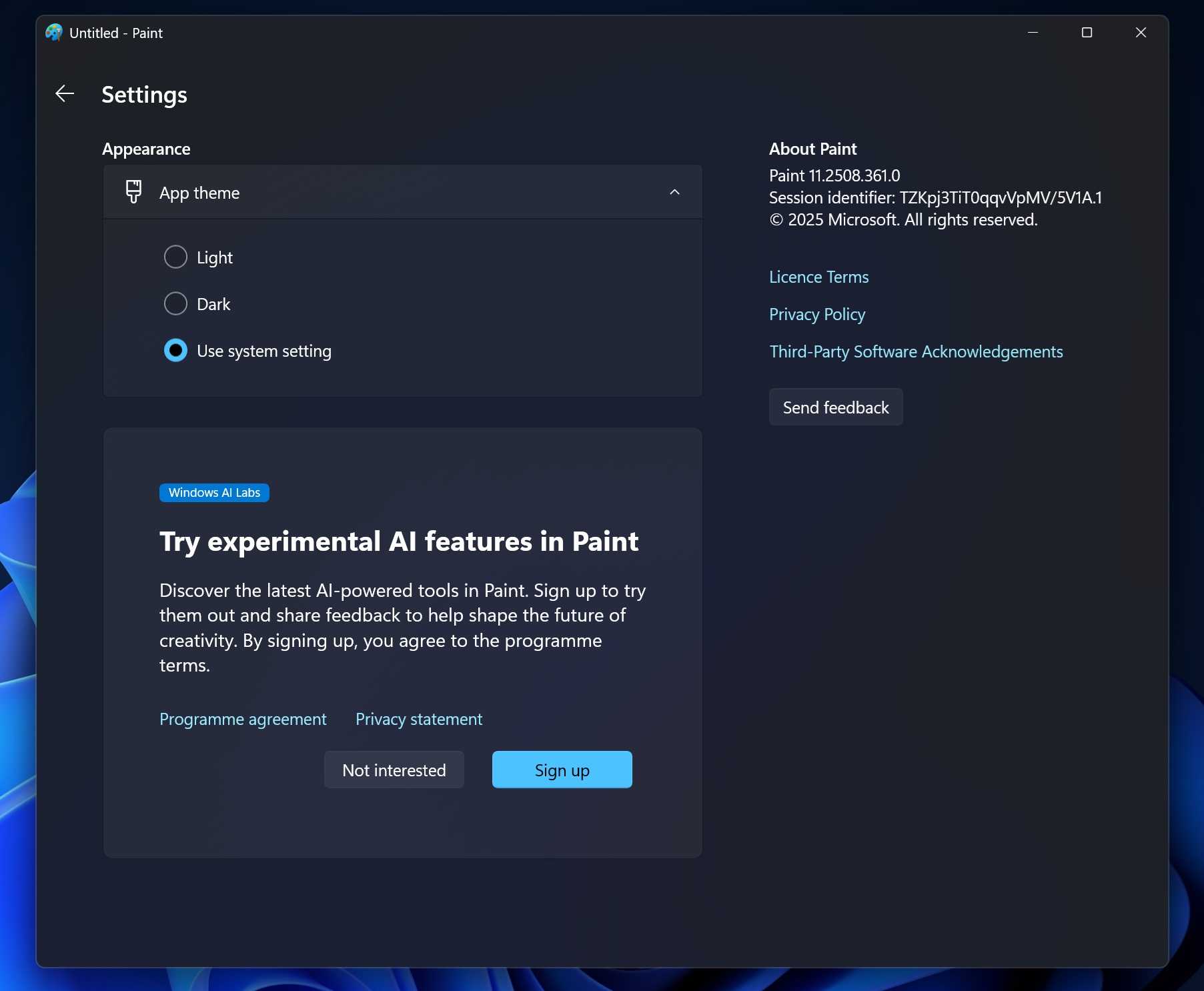 可能會要求您註冊“Windows AI Labs”以嘗試畫圖中的一些新功能。為此,請打開“設置”並查找上面的橫幅。它仍在通過服務器端更新推出,可能不會顯示。