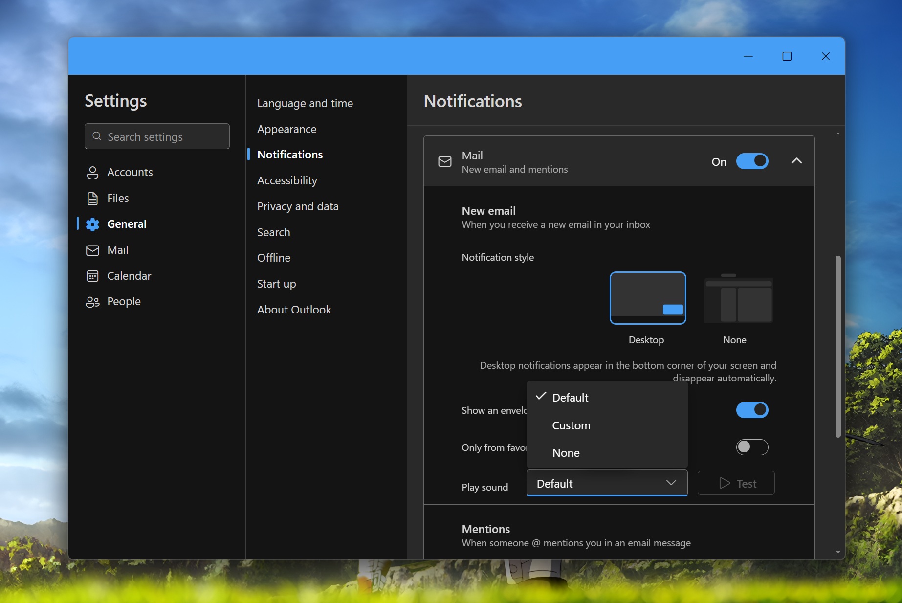 您會在“通知設置”頁面的“通知我有關”部分下找到一個新的“播放聲音”選項。單擊“播放聲音”選項將展開下拉列表以包括“沒有任何,” “風俗,“ 和 ”預設“ 選項。